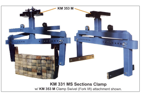 KM 331 MS | Sections ClampAutomatic latch and trelease, single line, narrow, mechanical clamp for handling stacked pavers, bricks, etc. Features durable replaceable, polymer gripping pads which can be rotated 90 degrees for handling vertically stacked materials. Minimum hook height = 40"; Clamping range: 42" max to 10" min. Capacity: 1,600 lbs. |